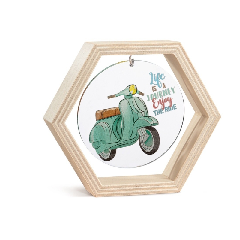Ξύλινο διακοσμητικό σε σχήμα πολύγωνο.Το καδράκι είναι διακοσμημένο με στρογγυλή print plexiglass παράσταση σε διάφανο χρώμα.Η παράσταση απεικονίζει μια βεραμάν βέσπα και μότο "Life is a journey enjoy the ride".