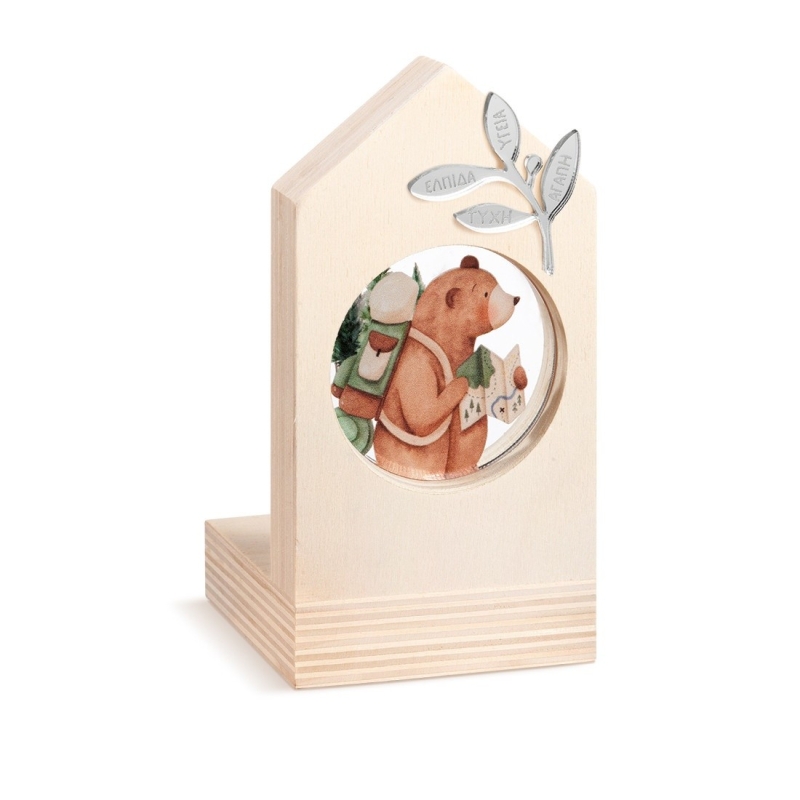 Ξύλινο διακοσμητικό σπιτάκι με ρεσώ.Το σπιτάκι είναι διακοσμημένο με στρογγυλό print plexiglass σε διάφανο χρώμα.Η παράσταση απεικονίζει την αρκούδα να πηγαίνει camping.