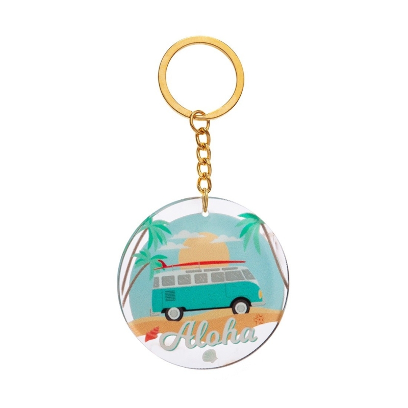 Μπρελόκ με στρογγυλή print παράσταση από plexiglass σε διάφανο χρώμα. Η παράσταση απεικονίζει ένα βεραμάν van ALOHA.