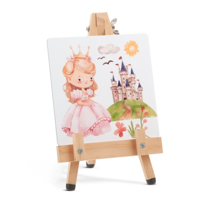 Ξύλινο καβαλέτο με print plexiglass παραλληλόγραμμο.Η παράσταση απεικονίζει σε λευκό χρώμα την πριγκίπισσα του παραμυθιού με φόντο το κάστρο.
