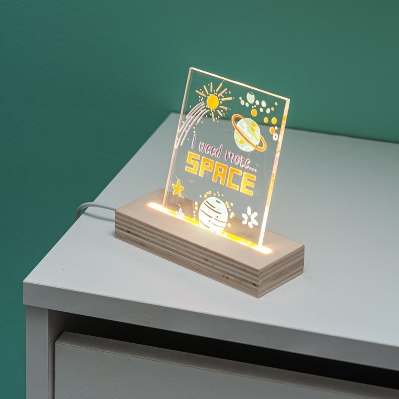 Ξύλινη βάση με Led φωτισμό και καδράκι από διάφανο plexiglass. Η παράσταση απεικονίζει το διάστημα και moto "I need more…SPACE".