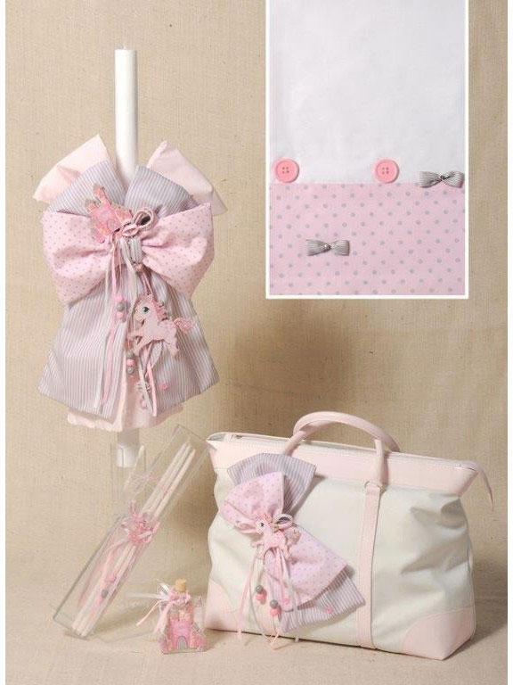 Σετ Βάπτισης με θέμα αλογάκι σε απόχρωση εκρού - ροζ. Το σετ περιλαμβάνει βαλίτσα χειροποίητη, σετ λαδόπανα, λαμπάδα και σετ λαδικού όλα στολισμένα στο ίδιο θέμα.