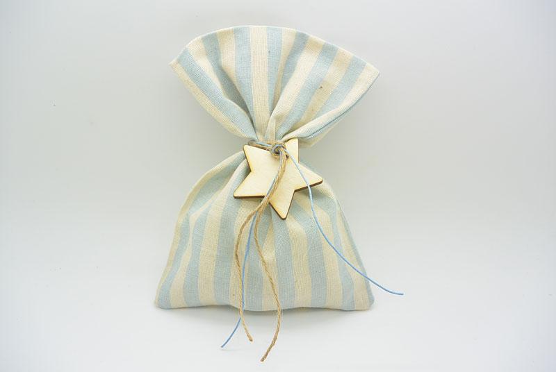 Μπομπονιέρα Βάπτισης πουγκί λινό ριγέ σε σιέλ απόχρωση και διακοσμητικό ξύλινο αστεράκι. Η τιμή αφορά δεμένη μπομπονιέρα με 5 κουφέτα αμυγδάλου ή 9 κουφετάκια smarties. Διαστάσεις πουγκί 14 X 20 εκ και αστεράκι 5 εκ.