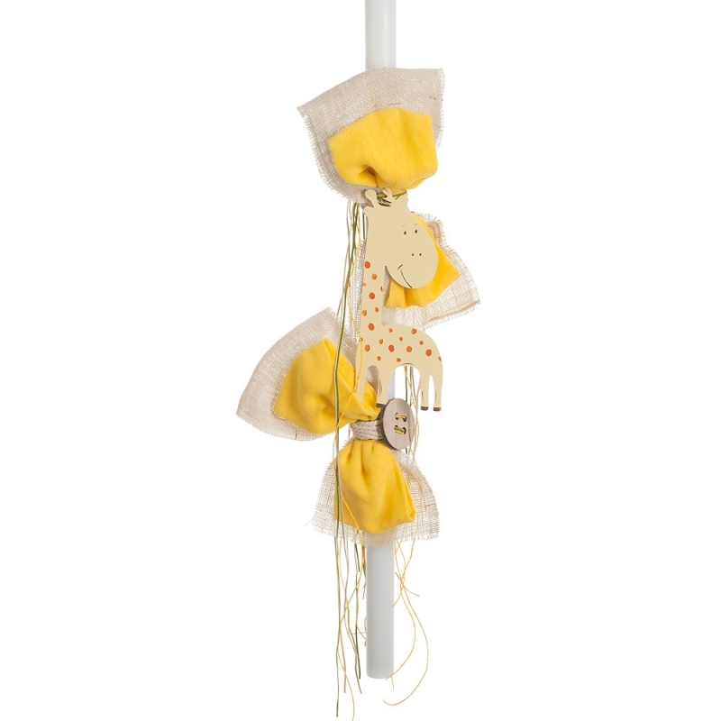 Λαμπάδα βάπτισης, δεμένη με φιόγκους από γάζα εκρού και κίτρινη και διακοσμημένη με ξύλινη καμηλοπάρδαλη,ξύλινο κουμπί μεγάλο και πολύχρωμα κορδόνια σε κίτρινες-πράσινες αποχρώσεις