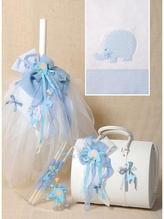 Σετ Βάπτισης ελεφαντάκι και καμηλοπάρδαλη σε απόχρωση λευκό - σιέλ. Το σετ περιλαμβάνει βαλίτσα δερματίνη, σετ λαδόπανα, λαμπάδα και σετ λαδικού όλα στολισμένα στο ίδιο θέμα.