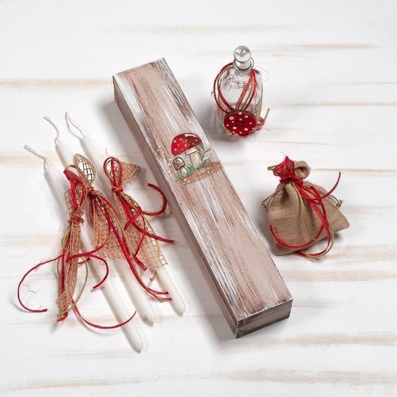 Ξύλινο κουτί συσκευασίας παραλληλόγραμμο σε καφέ brush απόχρωση και ζωγραφισμένα μανιτάρια. Ο κωδικός περιλαμβάνει στολισμένα τα 3 κεράκια,το σαπούνι μέσα σε πουγκάκι και μπουκάλι του λαδιού.
