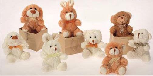 Μπομπονιέρα Βάπτισης λούτρινα ζωάκια διάφορα σε σακουλάκι χάρτινο. Η τιμή περιλαμβάνει το δέσιμο της μπομπονιέρας με 9 κουφετάκια smarties ή 5 κουφέτα αμυγδάλου. Διάσταση 9 x 15 cm.