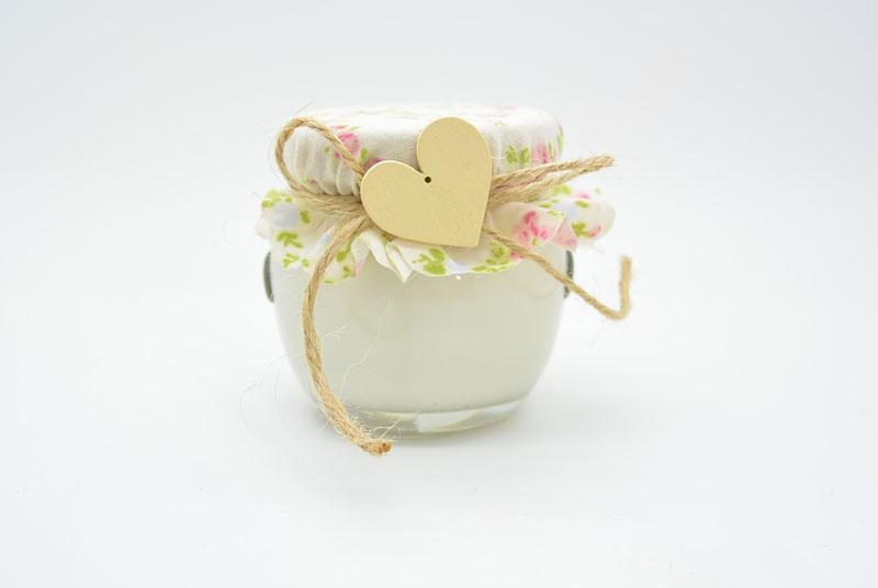 Βαζάκι με βανίλια για κέρασμα σε γάμο ή βάπτιση φλοράλ και ξύλινη διακοσμητική καρδιά, χωρητικότητας 106 ml. Η τιμή αφορά το βαζάκι στολισμένο. Τα χρώματα μπορούν να γίνουν ανάλογα με τα χρώματα του γάμου σας.