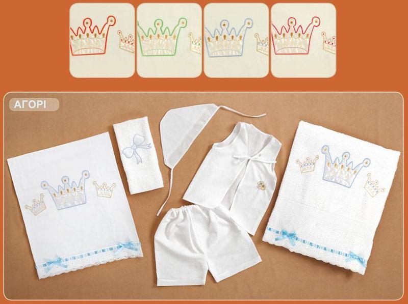 Λαδόπανα με σχέδιο κορώνα για αγοράκι ελληνικής κατασκευής άριστης ποιότητας σε διάφορες αποχρώσεις. Το σετ περιλαμβάνει πετσέτα μικρή και μεγάλη, σεντονάκι και σετ εσώρουχα.