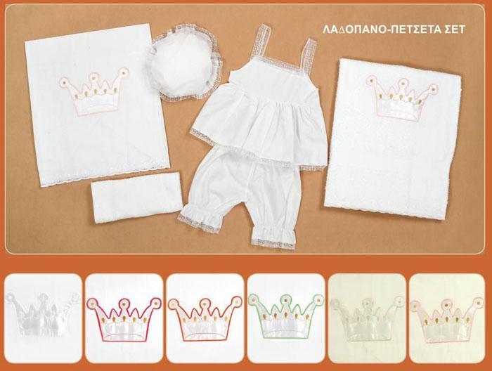 Λαδόπανα με σχέδιο κορώνα για κοριτσάκι ελληνικής κατασκευής άριστης ποιότητας σε διάφορες αποχρώσεις. Το σετ περιλαμβάνει πετσέτα μικρή και μεγάλη, σεντονάκι και σετ εσώρουχα.