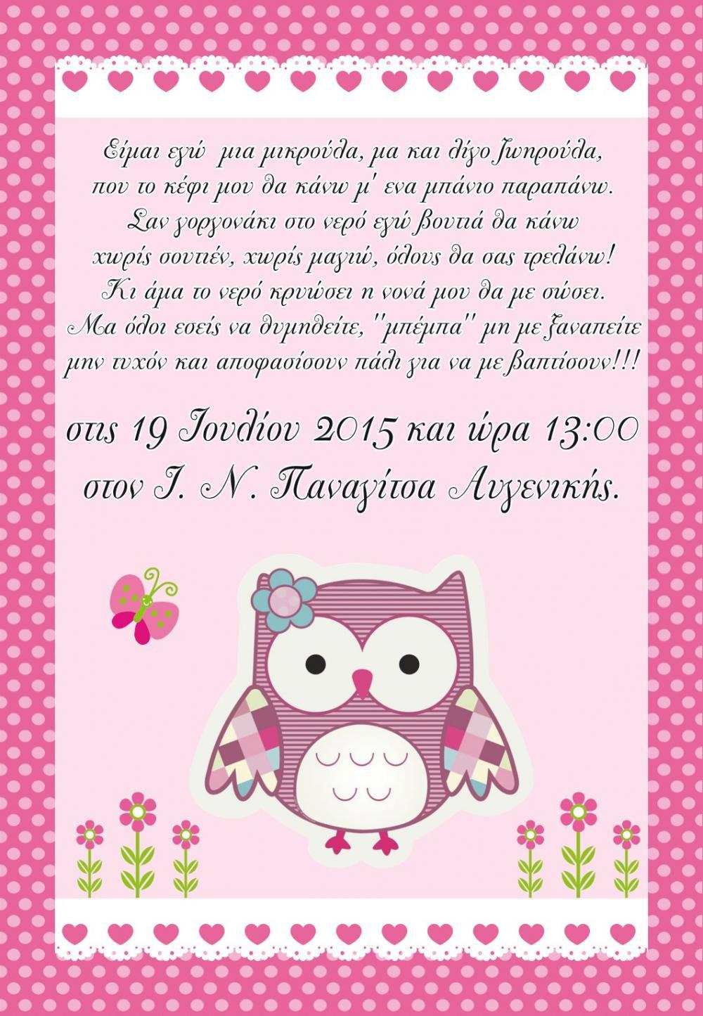 Οικονομικό Προσκλητήριο βάπτισης έγχρωμο με θέμα κουκουβάγια. Η τιμή αφορά και την εκτύπωση. Μπορεί να γίνει σε διάφορες διαστάσεις καθώς να δωθεί και ως ρολάκι.