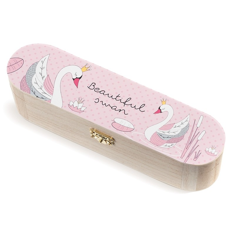 Ξύλινη natural κασετίνα με μεταλλικό κούμπωμα. Είναι διακοσμημένη με αυτοκόλλητο print κύκνος.