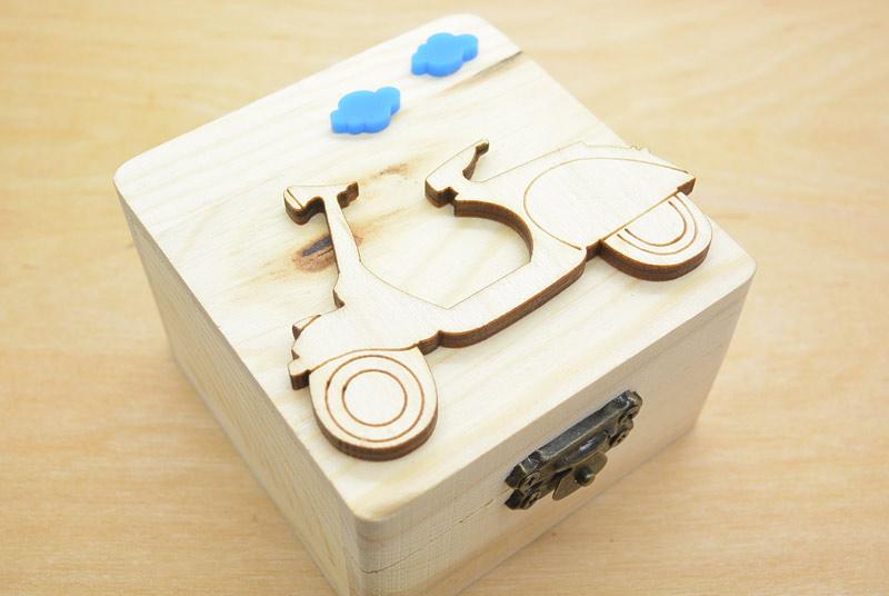 Μπομπονιέρα Ξύλινο κουτί βέσπα με λεπτομέρειες plexiglass. Διάσταση 8 x 8 x 5  cm. Η τιμή αφορά σκέτο το αντικείμενο. Απο το υπομενού μπορείτε να επιλέξετε με επιπλέον χρέωση να γίνει δεμένη μπομπονιέρα με 5 κουφέτα αμυγδάλου ή 9 smarties.