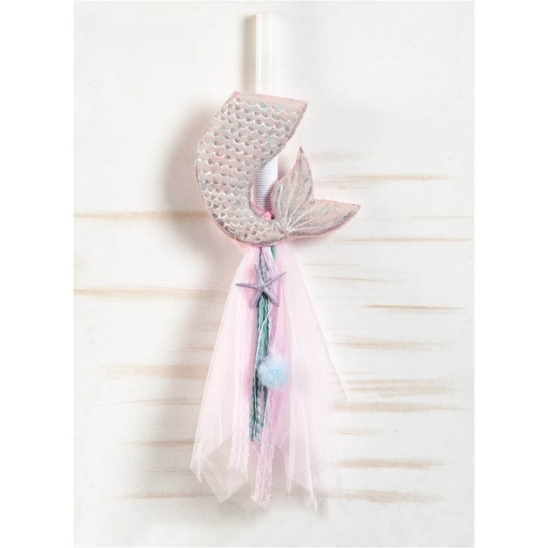 Λαμπάδα βάπτισης με θέμα η ούρα της γοργόνας σε πάνινη χειροποίητη παράσταση. Είναι τυλιγμένη με λευκό υφασμάτινο κορδόνι και στο κάτω μέρος πέφτει ριχτό λευκό και ροζ παλ τούλι. Η θαλασσινή πινελιά συμπληρώνεται με τον πολυεστερικό αστερία σε glitter απόχρωση.