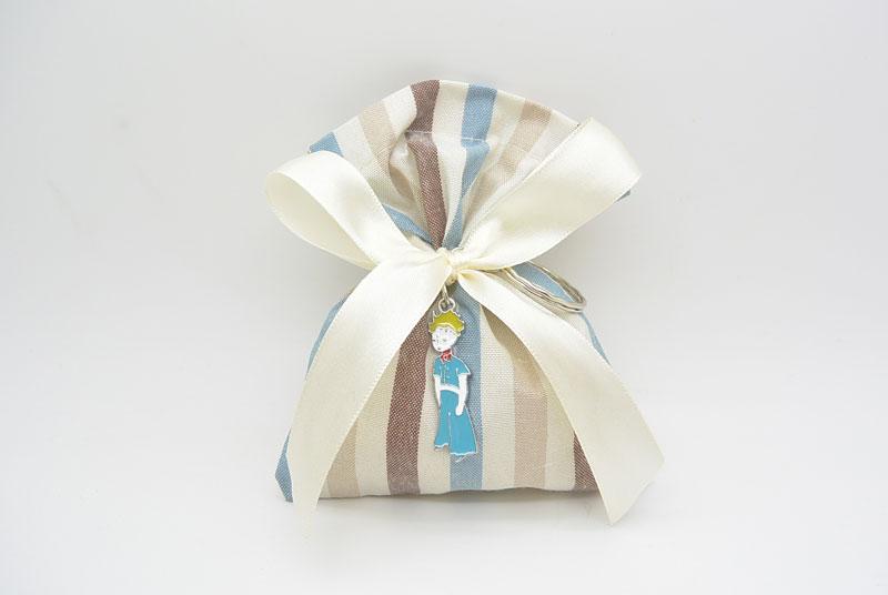 Μπομπονιέρα Βάπτισης πουγκί μικρός πρίγκιπας . Η τιμή περιλαμβάνει το δέσιμο της μπομπονιέρας με 9 κουφετάκια smarties ή 5 κουφέτα αμυγδάλου. Διαστάσεις μπρελόκ 10.5 εκ και πουγκί 11x15 εκ.