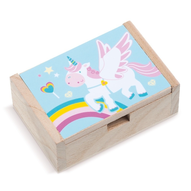 Ξύλινο natural παραλληλόγραμο κουτί. Είναι διακοσμημένο με αυτοκόλλητο print μονόκερος σε σιέλ-ροζ αποχρώσεις.