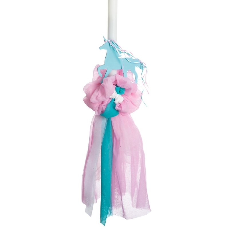 Λαμπάδα βάπτισης, δεμένη σε στυλ pom pom με γάζα σε αποχρώσεις ροζ-λευκές-τιρκουάζ,οι οποίες πέφτουν ριχτές κατά μήκος της λαμπάδας και διακοσμημένη με ξύλινο μονόκερο βεραμάν