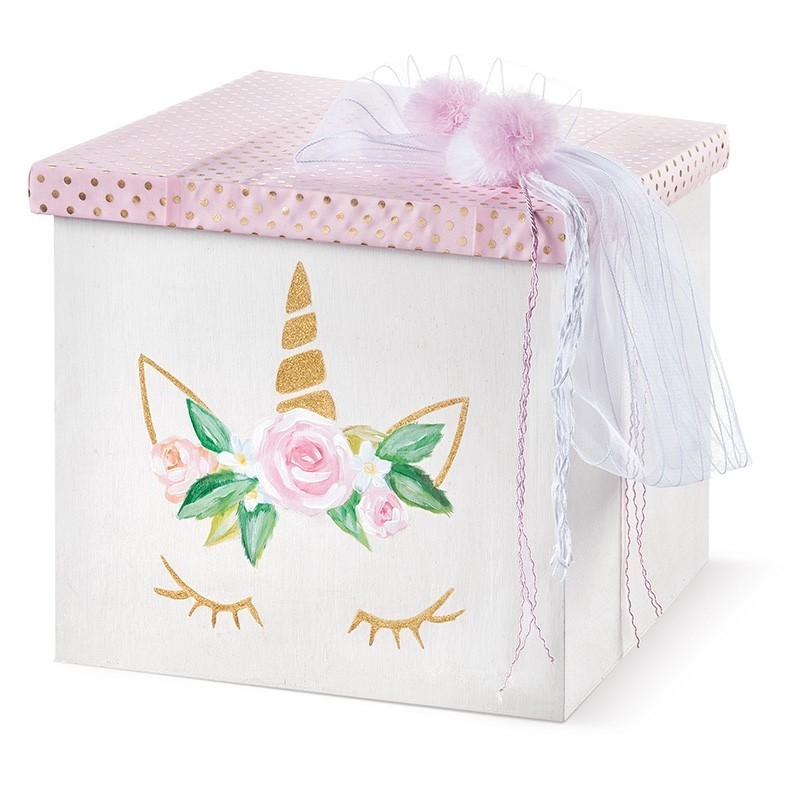 Ξύλινος λευκός κύβος,συσκευασία βάπτισης ζωγραφισμένη στο χέρι με θέμα τον μονόκερο σε ροζ-χρυσές αποχρώσεις.Το καπάκι του κύβου είναι ντυμένο με ροζ υφασμάτινο ρολό με print πουά χρυσά και διακοσμημένο με λευκό ριγωτό τούλι και ροζ-λευκά pompom,ενώ το μπροστινό τμήμα του κύβου είναι ζωγραφισμένο με τμήμα από το κεφάλι του μονόκερου σε βασικές αποχρώσεις χρυσές-ροζ.