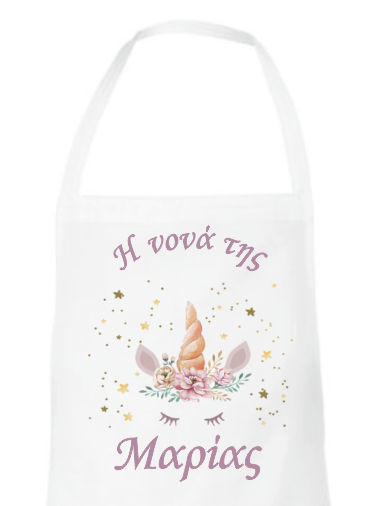 Λευκή ποδιά για το νονό ή τη νονά, εκτυπωμένη με θέμα "Μονόκερος". Γράψτε στα σχόλια μέσα στο καλάθι το όνομα του παιδιού σας.
