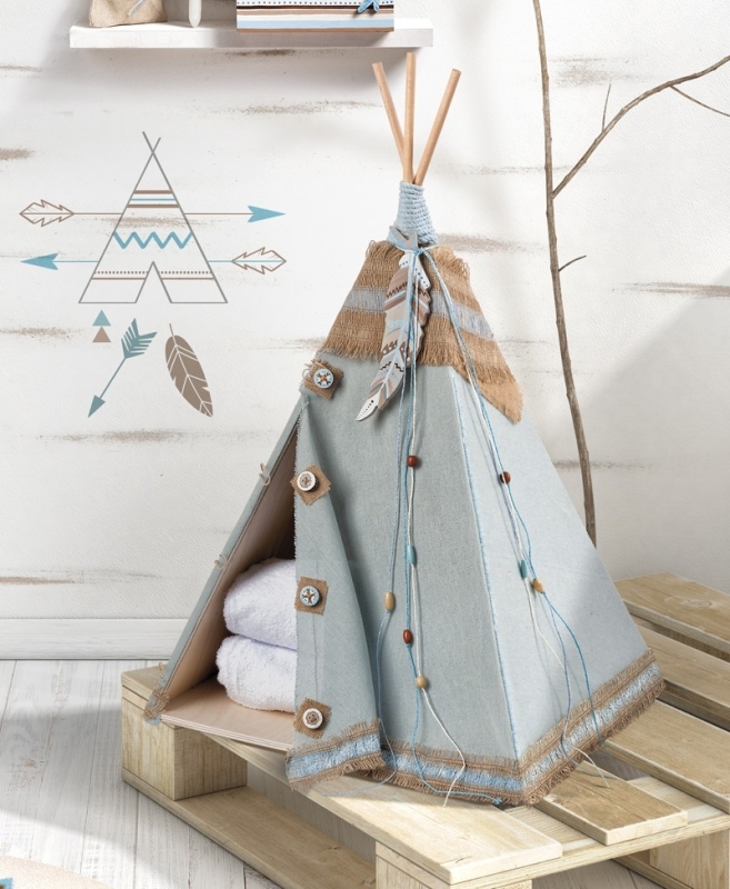 Ξύλινη natural σκηνή, συσκευασία βάπτισης σε ethnic στυλ,ντυμένη με ύφασμα σιέλ και διακοσμημένη με τσουβάλι φυσικές-σιέλ αποχρώσεις και ξύλινο φτερό με πολλά ethnic στοιχεία