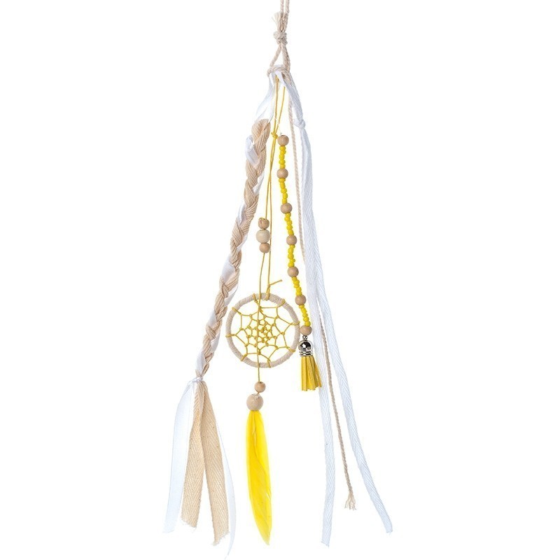 Υφασμάτινη κρεμαστή διακοσμητική πλεκτή ονειροπαγίδα. Διακοσμημένη με χάντρες, κορδέλες σε πλεξούδα και φούντα. Ιδανική για ethnic στολισμούς και διακοσμήσεις