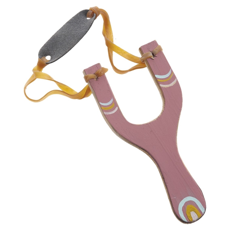 Ξύλινη ζωγραφιστή σφεντόνα σε βάση αντικέ ροζ και ουράνιο τόξο.