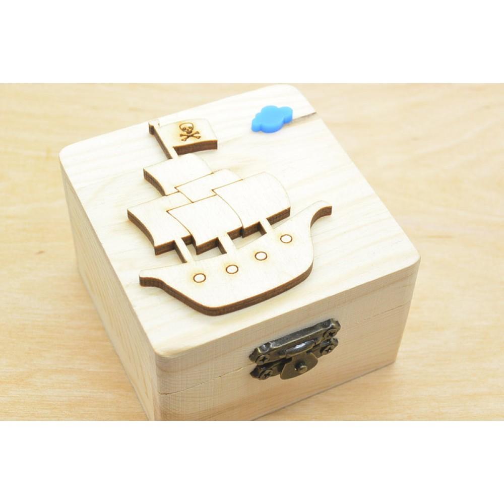 Ξύλινο κουτί πειρατικό καράβι με λεπτομέρειες plexiglass μπορείτε να επιλέξετε το χρώμα στις λεπτομέρειες plexiglass. Διάσταση κουτί 8 x 8 x 5  cm.