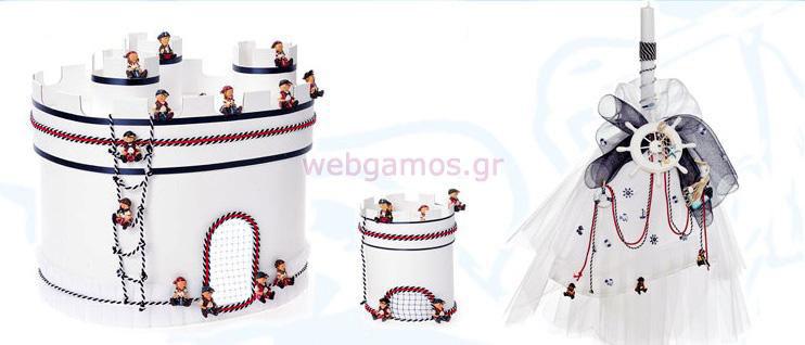 Οικονομικό Σετ βάπτισης με βαλίτσα βαπτιστικών με σχέδιο πύργο στολισμένο σε λευκό - μαρίν  απόχρωση με θέμα πειρατές. Η τιμή περιλαμβάνει βαλίτσα βάπτισης στολισμένη, βαλιτσάκι λαδικού στολισμένο, λαμπάδα βάπτισης στολισμένη, σετ λαδόπανα και εσώρουχα, σαπουνάκι και μπουκαλάκι για το λάδι στολισμένο και 3 κεράκια.
