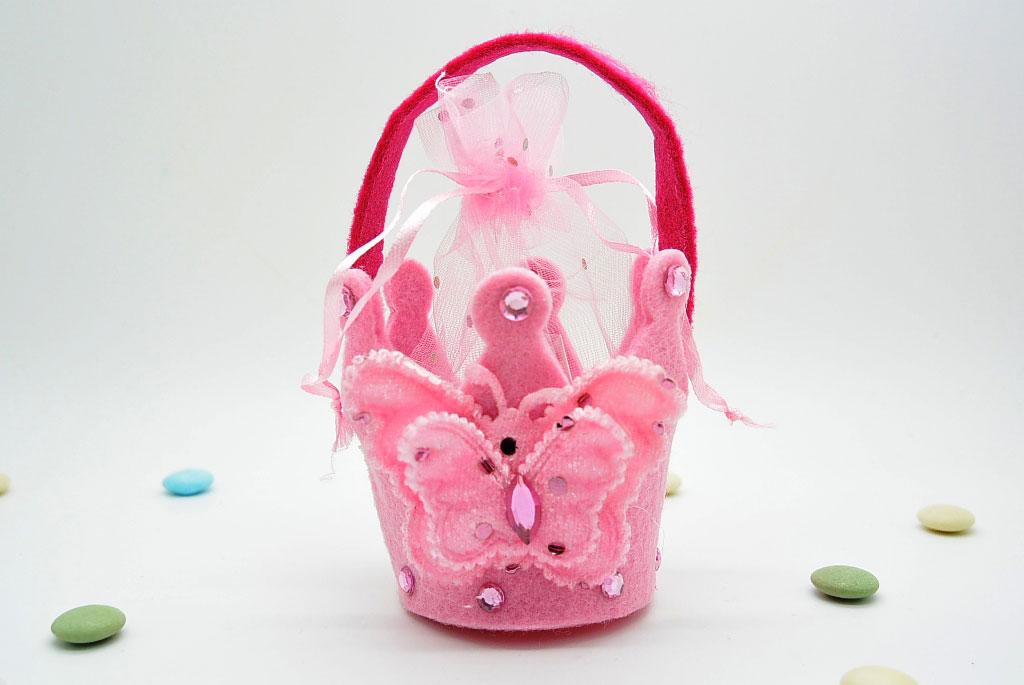 Μπομπονιέρα βάπτισης πεταλούδα σε πουγκί καλαθάκι. Στην τιμή περιλαμβάνονται το δέσιμο της μπομπονιέρας με 9 κουφετάκια smarties ή 5 αμυγδάλου. Διαστάσεις 10 x 7 εκ. Μπορεί να γίνει σε διάφορες αποχρώσεις.