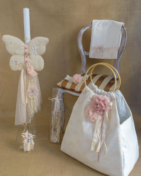 Σετ Βάπτισης πεταλούδα. Το σετ περιλαμβάνει βαλίτσα χειροποίητη, σετ λαδόπανα, λαμπάδα και σετ λαδικού όλα στολισμένα στο ίδιο θέμα.