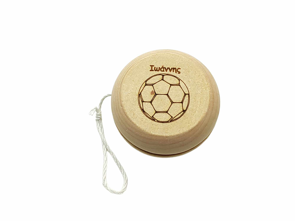 Ξύλινο ΓΙΟ ΓΙΟ μπάλα ποδοσφαίρου με το όνομα του παιδιού σας. Μπορεί να γίνει σε ότι σχέδιο ή θέμα θέλετε. Διάμετρος 5,5 εκ.