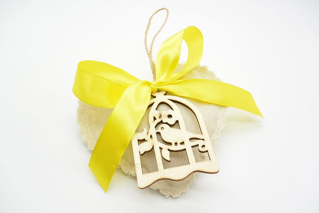 Μπομπονιέρα Πουγκί με σχέδιο καρδιά και διακοσμητικό ξύλινο πουλάκι. Η τιμή αφορά δεμένη μπομπονιέρα με 5 κουφέτα αμυγδάλου ή 9 κουφετάκια smarties. Διάσταση πουγκάκι 12cm x 12 cm. Το χρώμα της κορδέλας μπορεί να αλλάξει.