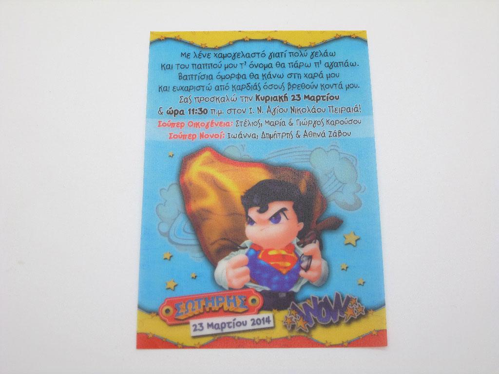 Οικονομικό Προσκλητήριο βάπτισης έγχρωμο με θέμα σούπερμαν. Η τιμή αφορά την διάσταση 9 x 13 cm και την εκτύπωση.