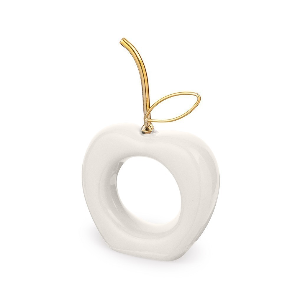 Πορσελάνινο διακοσμητικό μήλο με στρογγυλό άνοιγμα στη μέση. Είναι σε χρώμα λευκό με χρυσό μεταλλικό κοτσάνι.