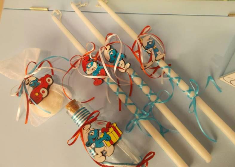 Σετ λαδικού με θέμα στρουμφάκια το οποίο περιλαμβάνει 3 κεράκια για την κολυμπήθρα, σαπουνάκι και μπουκαλάκι για το λάδι. Μπορούν να γίνουν ότι φιγούρες θέλετε.