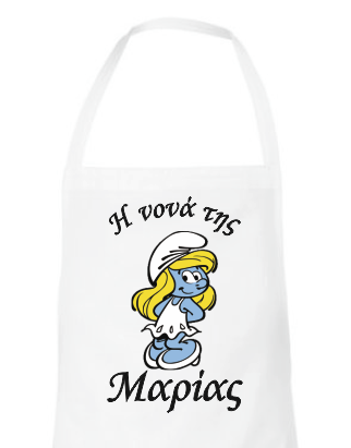Λευκή ποδιά για το νονό ή τη νονά, εκτυπωμένη με θέμα "Στρουμφίτα". Γράψτε στα σχόλια μέσα στο καλάθι το όνομα του παιδιού σας.