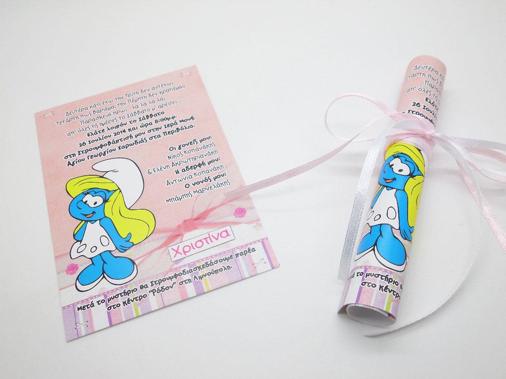 Οικονομικό Προσκλητήριο βάπτισης με θέμα στρουμφίτα. Η τιμή αφορά και την εκτύπωση. Μπορεί να γίνει σε διάφορες διαστάσεις καθώς να δωθεί και ως ρολάκι.