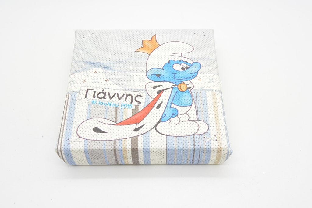 Μπομπονιέρα Βάπτισης καδράκι από καμβά με στρουμφάκι πρίγκιπα. Η διάσταση από το καδράκι είναι 10 x 10 cm. Μπορεί να γίνει οποιαδήποτε φιγούρα στρουμφάκι θέλετε. Η τιμή περιλαμβάνει το δέσιμο της μπομπονιέρας με 5 κουφέτα αμυγδάλου ή 9 κουφετάκια smarties.