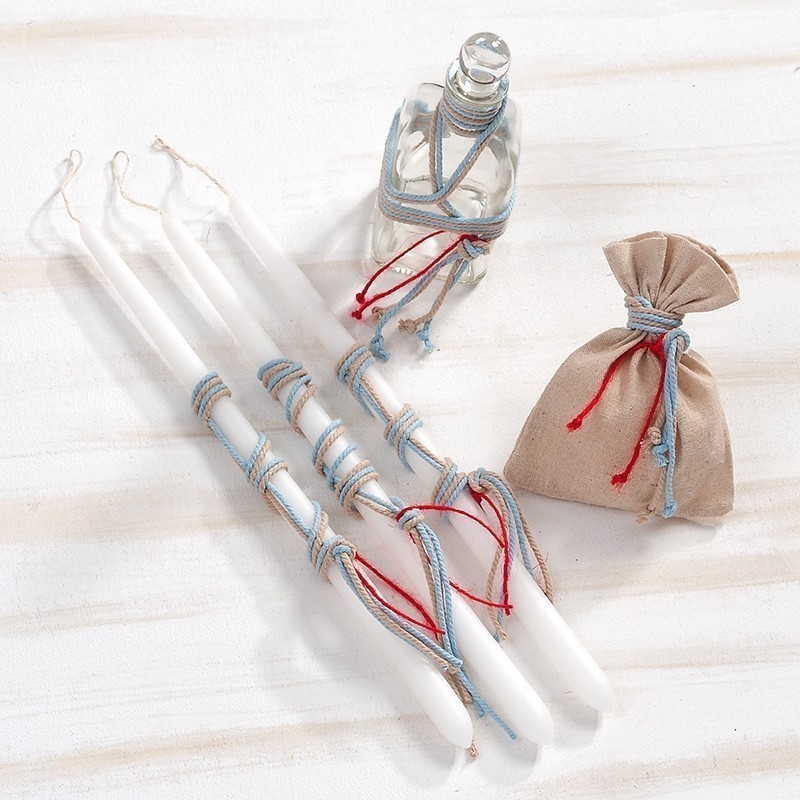 Σετ λαδιού, στολισμένα με κορδόνια καφέ-σιέλ και κόκκινα.Ο κωδικός περιλαμβάνει το μπουκάλι του λαδιού,το σαπούνι μέσα σε πουγκάκι και τα 3 κεράκια,όλα στολισμένα σε καφέ-σιέλ-κόκκινες αποχρώσεις
