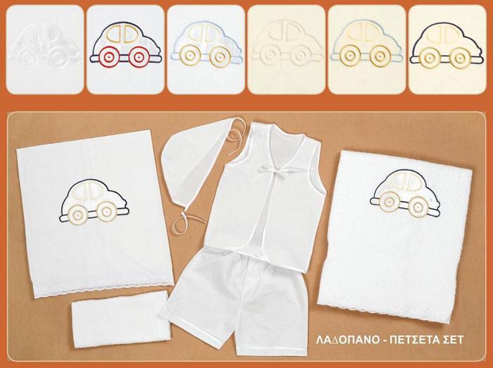 Λαδόπανα με θέμα αυτοκίνητο ελληνικής κατασκευής άριστης ποιότητας σε διάφορες αποχρώσεις. Το σετ περιλαμβάνει πετσέτα μικρή και μεγάλη, σεντονάκι και σετ εσώρουχα.