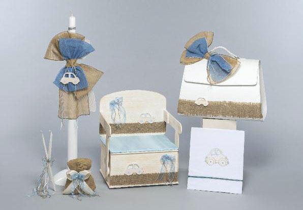 Σετ Βάπτισης με θέμα αυτοκινητάκι το οποίο περιλαμβάνει βαλίτσα ή καναπέ θρανίο ξύλινο, λαδόπανα, σετ λαδικού και λαμπάδα. Μπορείτε να επιλέξετε αν θέλετε βαλίτσα ή καναπέ θρανίο ξύλινο. Η τιμή αφορά το σετ με την βαλίτσα.