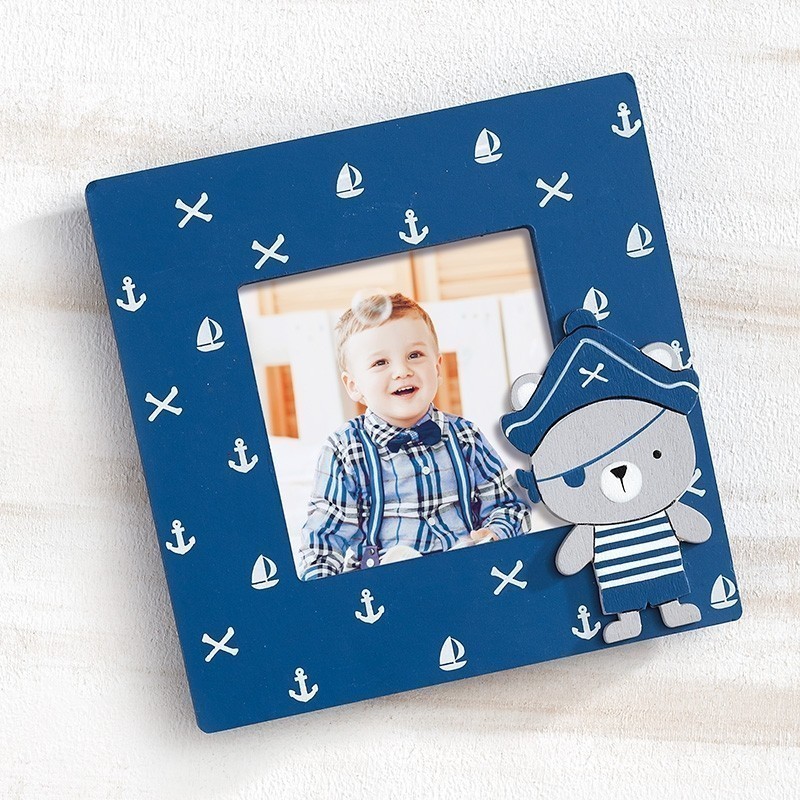 Ξύλινη τετράγωνη κορνίζα ναυτική σε μπλε απόχρωση με ναυτικό αρκουδάκι-πειρατή σε απόχρωση γκρι-μπλε