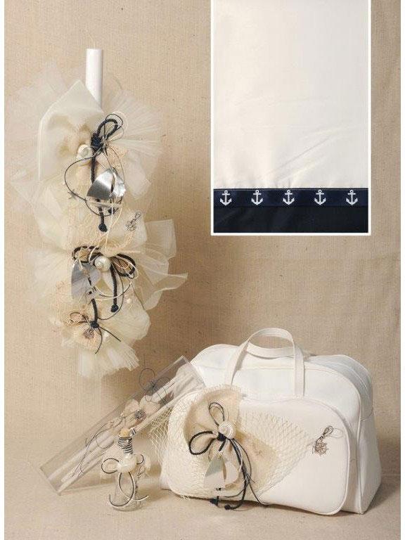 Σετ Βάπτισης θαλασσινό σε απόχρωση εκρού - μπλε navy. Το σετ περιλαμβάνει βαλίτσα χειροποίητη, σετ λαδόπανα, λαμπάδα και σετ λαδικού όλα στολισμένα στο ίδιο θέμα.
