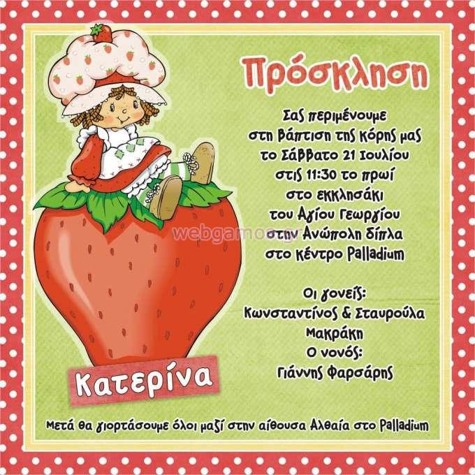 Οικονομικό Προσκλητήριο βάπτισης έγχρωμο με θέμα φράουλα. Η τιμή αφορά και την εκτύπωση. Μπορεί να γίνει σε διάφορες διαστάσεις καθώς να δωθεί και ως ρολάκι.