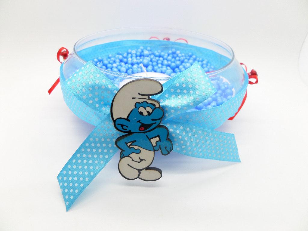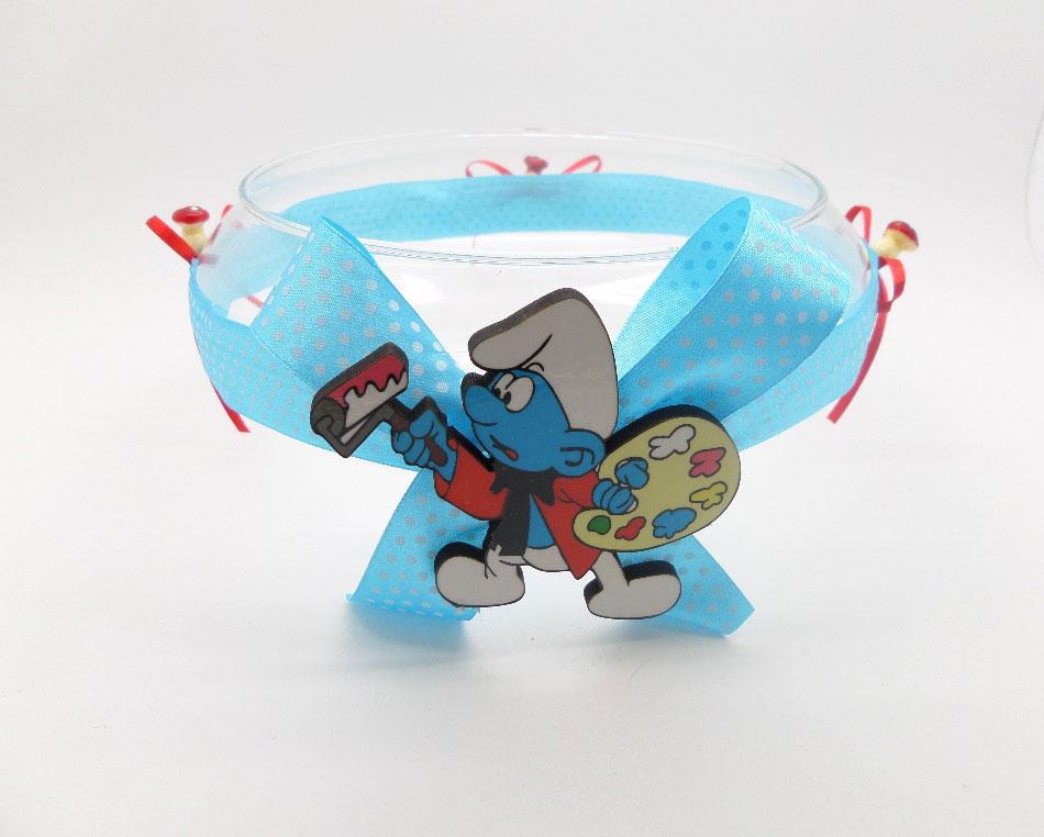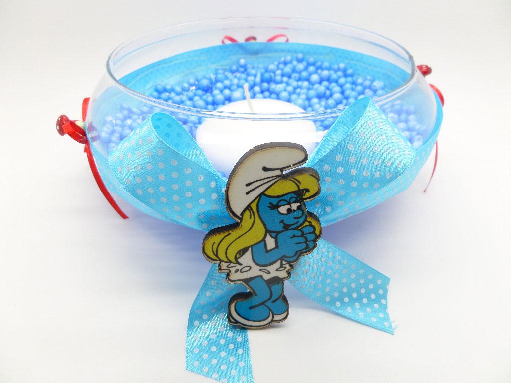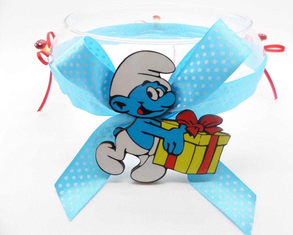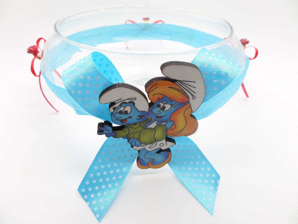 Διακοσμητική Γυάλα στολισμένη με στρουμφάκι. Μπορεί να γίνει οποιοδήποτε στρουμφάκι της επιλογής σας καθώς και στα χρώματα που θέλετε. Η τιμή περιλαμβάνει διακοσμητική γυάλα με υψος 7 εκ  και διαμετρο 20 εκ, διακοσμητικο στρουμφάκι της επιλογής σας με διαστάσεις 10 εκ, διακοσμητικο κερί και μπαλίτσες αφρού για το εσωτερικό.