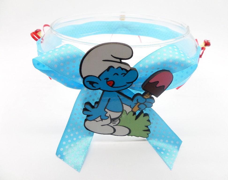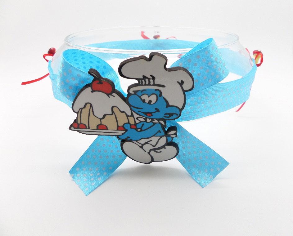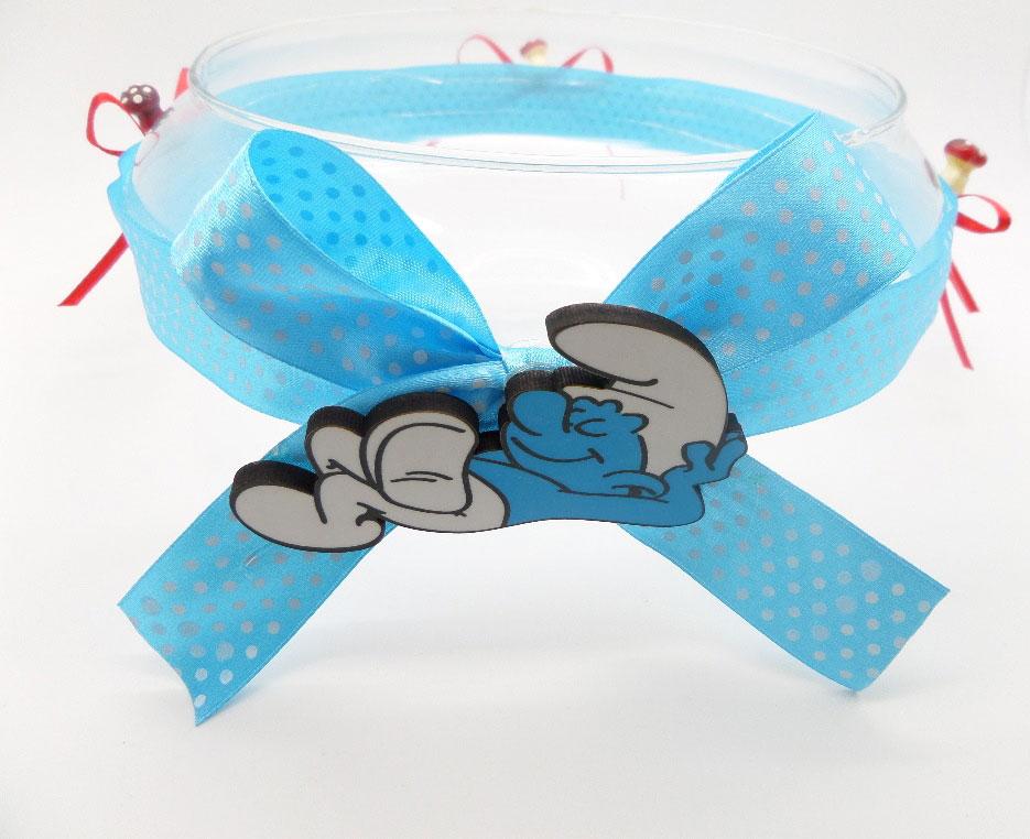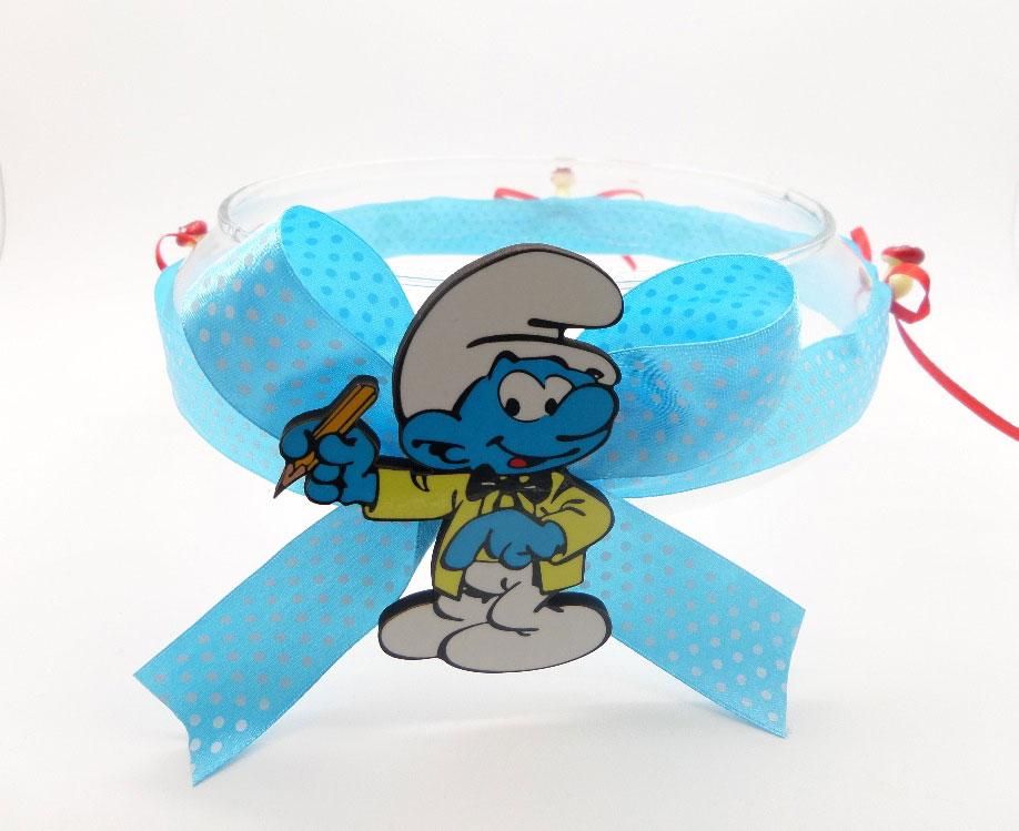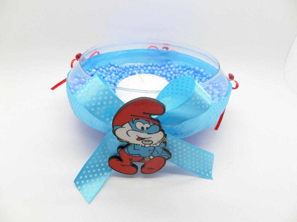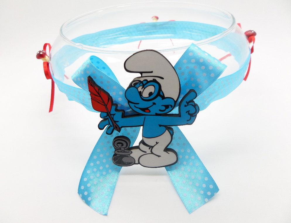 Διακοσμητική Γυάλα στολισμένη με στρουμφάκι. Μπορεί να γίνει οποιοδήποτε στρουμφάκι της επιλογής σας καθώς και στα χρώματα που θέλετε. Η τιμή περιλαμβάνει διακοσμητική γυάλα με υψος 7 εκ  και διαμετρο 20 εκ, διακοσμητικο στρουμφάκι της επιλογής σας με διαστάσεις 10 εκ, διακοσμητικο κερί και μπαλίτσες αφρού για το εσωτερικό.