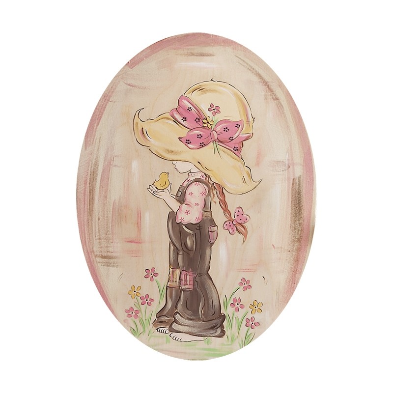 Ξύλινο οβάλ καδράκι natural με τη Sarah Kay να κρατάει ένα πουλάκι με σβησίματα καφέ-ροζ, ιδανικό για διακοσμήσεις και κατασκευές