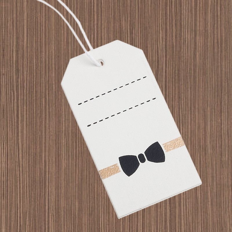 Ξύλινη κρεμαστή ετικέτα σε λευκό χρώμα με γραμμές. Διακοσμημένη με print παράσταση παπιγιόν.