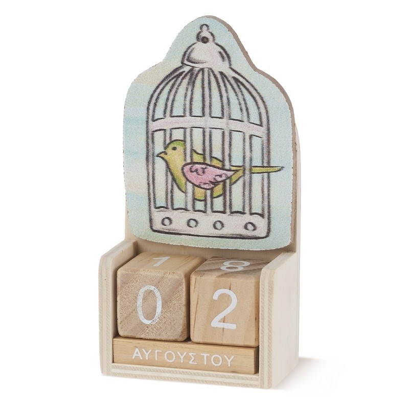 Ξύλινο ημερολόγιο με κύβους σε natural χρώμα. Διακοσμημένο με κοπτικό. Η παράσταση είναι κλουβί σε βεραμάν απόχρωση.