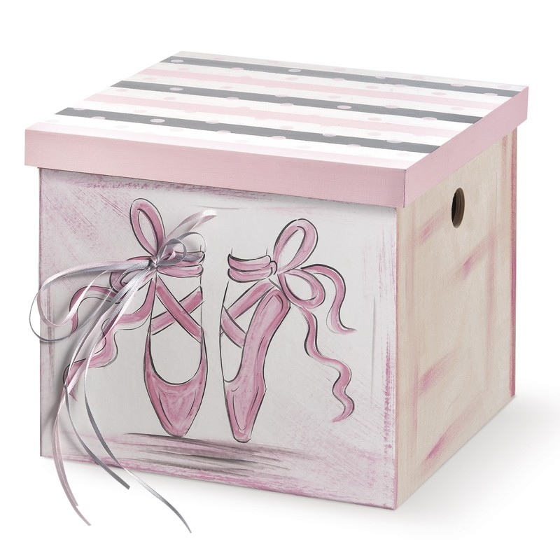Ξύλινος λευκός κύβος, συσκευασία βάπτισης ζωγραφισμένη στο χέρι με θέμα τις πουέντ. Το καπάκι του κύβου είναι ζωγραφισμένο με ρίγες γκρι-ροζ-λευκές με πουά και όλο το κουτί έχει σβησίματα ροζ-γκρι